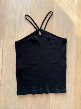 Classic black strappy tank top with a keyhole neckline. Soft, stretchy fabric for comfortable all-day wear. Versatile piece that layers easily and pairs with casual or dressy outfits. Black color adds a sleek, timeless look.