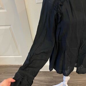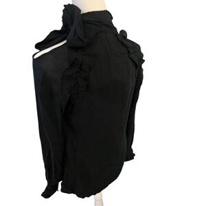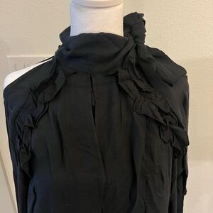 This chic black blouse by IRO features elegant ruffled details and stylish puff sleeves, offering a sophisticated and modern look. The neck tie adds a touch of charm, making it a versatile piece for various occasions. Crafted from a lightweight fabric, it ensures comfort and effortless style. Never worn. Size 34.