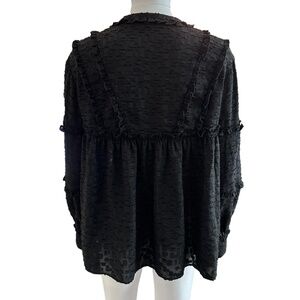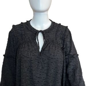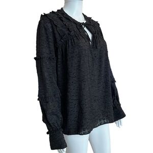 IRO Blouse Women's Size 34/US 4 Black Keyhole Neckline Long Sleeves with button at wrist, Ruffle Trim with asymmetrical squares.