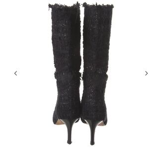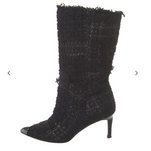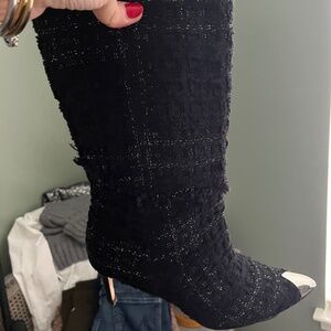 IRO mid calf black boot. Tweed faint metallic fabric with a semi pointed toe that is silver. They are gorgeous but tight on me, I did not want to stretch them. Leather bottoms. Very good condition, barely worn. 2.5 inch heel. Size 38.