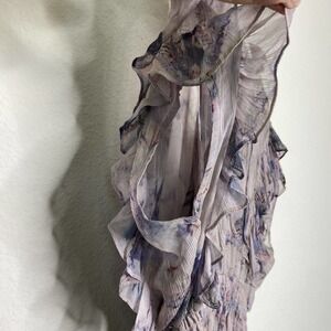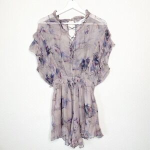 STUNNING romper by IRO new with tags. Romper is a shade of smoky gray purple and undertones of beige with a watercolor type print that resembles florals in shades of blue, purple, pink, green, etc. Elastic smocked waist. Ruffle at legs cuffs and sleeve holes. Laces up the front with a button tab closure at back of neck. Opening at back reveals a peek at the lining that matches the fabric. Two pockets. So pretty and versatile! All measurements are approximate, taken flat and closed with elastic at rest and not stretched.