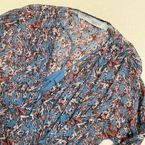 An abstract floral print with pretty ruffle trim and cuff detail, the Bustle mini Dress in Blue by IRO is designed as a long sleeved V neck wrap dress. Semi sheer but fully lined, this crepe style has a self belted waistline.