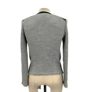 Gray and black Iro Ceylona knit jacket with quilted leather shoulders, dual zip pockets at bust, zip accents at sides with pockets and exposed zip closure at front.
