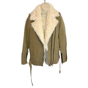 Crafted in a soft brown wool blend with an ultra-plush cream shearling collar and lining, this structured jacket features an asymmetrical zip front, zippered cuffs, and waist belt detailing for a timeless moto silhouette.