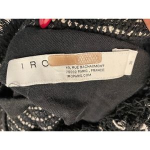 This classic black IRO Diana tweed jacket is a versatile addition to any wardrobe. The subtle Frye under the left armpit is barely noticeable and adds character to the piece. It is a size 36, regular fit, and made of high-quality tweed fabric. The jacket features a basic style with a front zipper and two pockets. The brand is IRO, known for its exceptional quality and timeless designs. This jacket is perfect for any occasion, whether you’re dressing up or down.