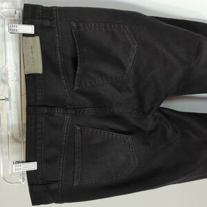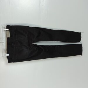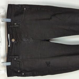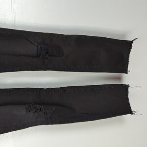 Black. Five pockets. Zip fly, button closure. Raw, frayed hem. Please see photos for details of distressing. Excellent condition -- no stains. Laid flat waist; 16in. Rise: 9in. Inseam: 27in.