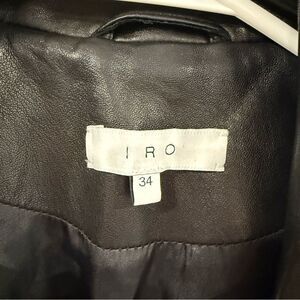 The "IRO Dumont" is a black leather motorcycle jacket for women, featuring a pointed collar, dual zipped welt pockets, a snapped flap pocket, and ruffle detailing on the sleeves. These jackets often feature details like silver-tone hardware and asymmetrical zippers.