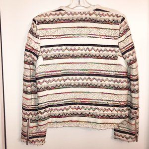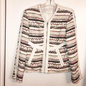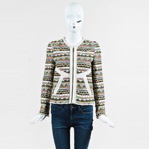 Bright colors offer a playful look as they thread through a crisp geometric pattern on a boxy bouclé blazer. Plush silk and leather piping add a luxe touch, and industrial zips close the placket, pockets, and cuffs. Lined.