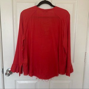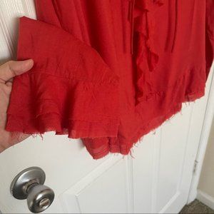 Romantic ruffles and sexy lace-up V neck make this red blouse fun! This would be so cute with leather leggings and heels for an autumn date night. French size 42 is a US 10, but it’s oversize and looks good from a US size 4-12.