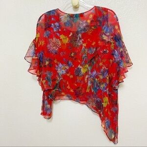 Chic silk top with allover floral print and ruffle overlay. * Roundneck * Dropped shoulders * Long tiered sleeves * Pullover style * Asymmetrical hem