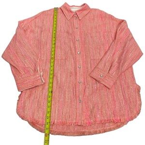 IRO Founda Fringed Bouclé Shirt Jacket with snap front, chest patch pockets, a fringed trim, point collar and long drop sleeves with snap cuffs. Oversized fit. Please see pictures for more details and measurements. IRO size 40 is US size 8.