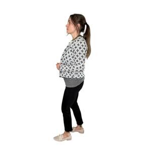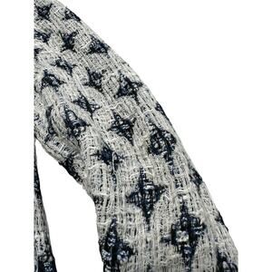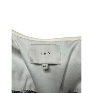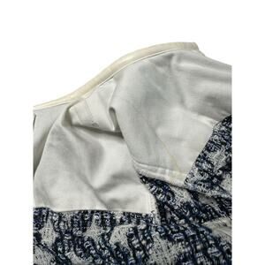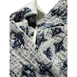 Handi tweed blue and white geometric tweed jacket from IRO in women's size 38 - US 4. This jacket has a few flaws to note: interior discoloration on the left shoulder, pulls, discoloration on the arms/fronts as shown and one of the snaps has come out as shown. Maybe can be repurposed or you can replace the snap.