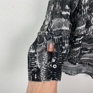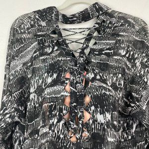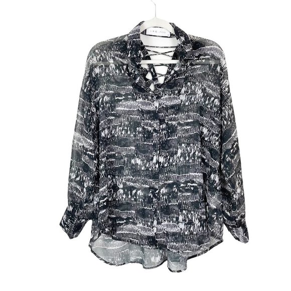 This is a long sleeve collared black and white tie dye patterned lace up/ braided back v neck semi- sheer blouse from IRO.