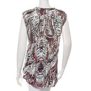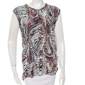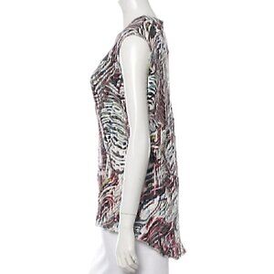White and multicolor Iro Joe perforated top with jewel neck, high-low hem and abstract print throughout. Designer size 0. Oversized