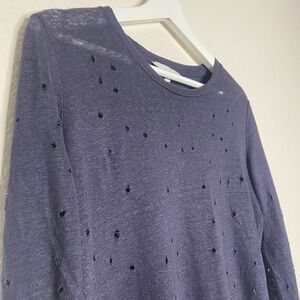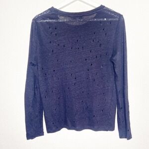 Very cool top by IRO. Long sleeved linen tee in a dark navy shade. Distressed holes throughout. A fun twist on a basic long sleeved tee. All measurements are approximate and taken flat.