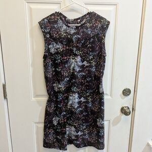 Elegant abstract print dress in a blend of colors. Perfect for any occasion.