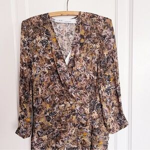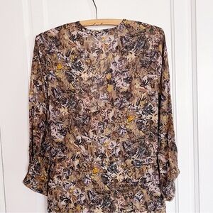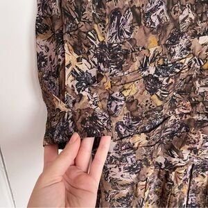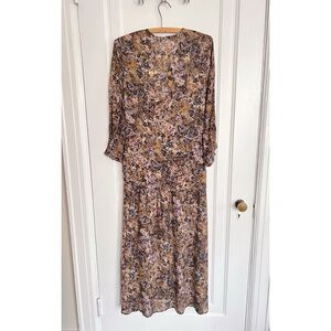Gorgeous dress by French designer label IRO. “Mauri” style in a semi-sheer rayon crepe ft an abstract floral pattern in autumnal tones. Surplice bodice, 3/4 sleeves, pleated dropped waist detailing, flowy long skirt. Side zip closure. Bust 35-36“, waist 28“, hips 40“, back length 51.5“. Size 36, equal to US 4, brand new with tags.
