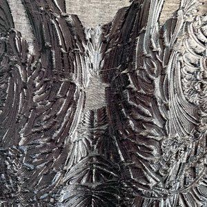 Super velvet textured burn out pattern that looks like feathers or wings. Very sheer silk and poly blend, with braided rope trim around neck. Like new. Front pattern only, back of shirt sheer fabric. Shoulders 17" 30" Length, Bust 38" and 38" waist.