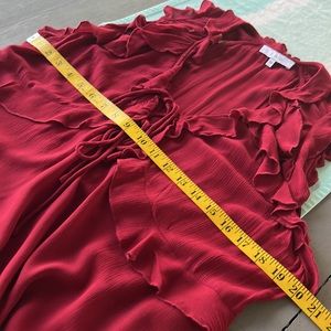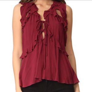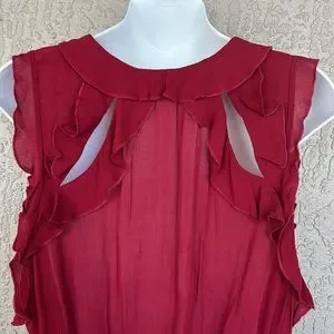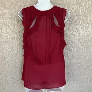 Stylish red top with ruffle details. Sleeveless design. Perfect for casual outings.