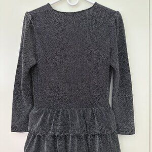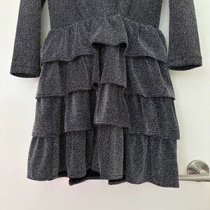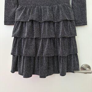 - High-impact metallic stripe mini dress with a cascading tiered skirt.