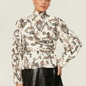 Printed satin (100% Viscose) Top. Mock neck. Long sleeves. Back zipper closure. 22.5" from shoulder to hemline. Made of imported materials, finished in the USA. Country of origin designation as provided by vendor and/or manufacturer.