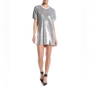 The Nabara Dress in Silver from IRO. This mini dress is covered in sequins for a fun look but has a causal T-shirt silhouette. It can be worn dressed up with heels or with sneakers for a laidback look. Exterior is sequin knit.