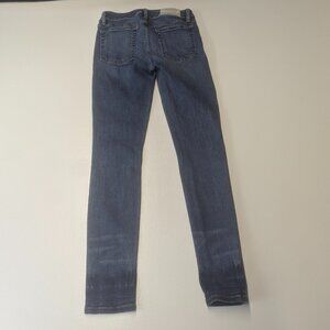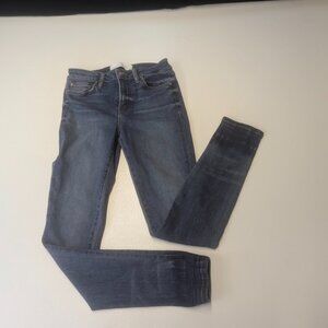 Dark vintage wash, with zipper/button fly and standard 5 pockets. High-rise, skinny legs, and in excellent condition!