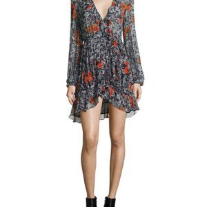 IRO Wrap Dress Denim/ orange Floral Print Ruffle Embellishment Long Sleeve with V-Neck Sash-Tie Closure at Front Designer