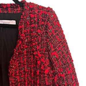 Gorgeous IRO red "houndstooth" styled boucle wool blend jacket. Fringed detail at the hem. Loose threads is the look of this jacket. There is a gold metallic yarn throughout.