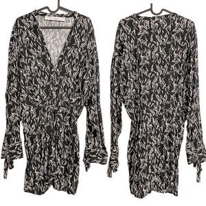 Features long sleeves, tie detail on the cuffs, plunging V neckline, faux wrap style skirt, side zip closure, day to night style can be dressed up or down, unlined, in black and white