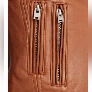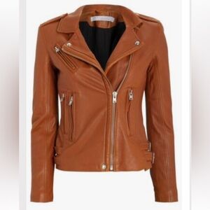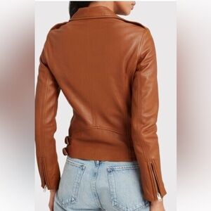 IRO's take on the quintessential moto-inspired jacket in cognac brown lamb leathter. Notched lapels. Epaulet straps. Chest zip pocket. Off center front zip closure. Zip sleeve cuffs. Side zip pockets. Adjustable waist straps. Belt details at hem. Unlined. In cognac.
