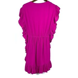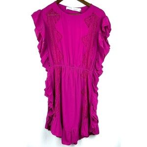 Beautiful mini dress featuring mesh lace inlets in the bodice and skirt. The skirt is fully lined, but the bodice is not. Ruffles are down both sides as well as the hemline. The ruffles create a flutter sleeve. There is a small elastic band at the waist to help cinch it.