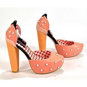 Too sweet to eat! Peaches and Cream Platforms are sky-high and irresistibly cute These eye-catching heels feature a chunky, cone-style base topped with a swirl of strawberry pink and finished with glimmering pearl embellishments—pure dessert for your feet!