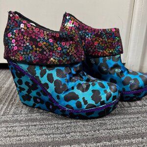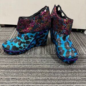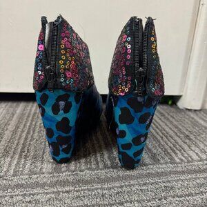 IRON FIST - WOMENS TREASURE BOX WEDGES IN TURQUOISE leopard sequin. These have been customized and are unique with glitter and additional sequins added.