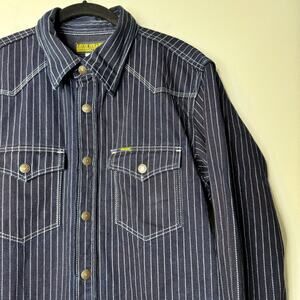 IRON HEART Stripe Denim Western Snap Button Shirt Indigo CPO Workwear Size XL