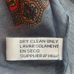 Design is of chains, straps and red gems, solid boarder, 100% polyester, size 39x39, colors may vary due to lighting, good used condition, OS