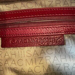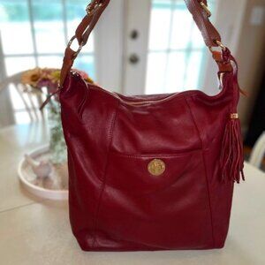 ISAAC MIZRAHI Pebbled Leather Hobo Shoulder Bag with Tassel - Bridge Hampton. 100% Leather. Pre-owned. Rich Maroon Red with contrasting Cognac strap. Gold hardware. Zippered closure. Lots of room! No odors. Lining in excellent condition. Front pocket with turn buckle closure. One interior zippered pocket. Back exterior zippered pocket. Bottom with feet protectors.