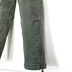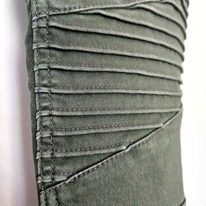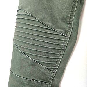 Slim, tapered maternity jeggings. in an olive army green. A nod to Balmain, there is ribbing detail on the thigh. Functioning zippered ankles. Two back pockets. Rugged, worn look. Maternity panel crisscrosses in the back. Hips have a lot of stretch.
