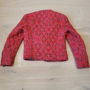 This jacket is quilted and reversible if you remove all the tags. One side has a red western banana print and the other is a navy blue with white circles and stars. Its two jackets in one!