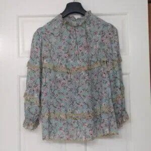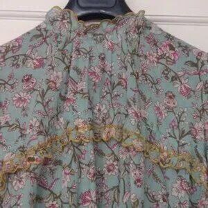 BLUE GREEN FLORAL PRINT TOP WITH CONTRASTING EMBROIDERED DETAILS AND SCALLOPED RUFFLES THROUGHOUT.