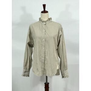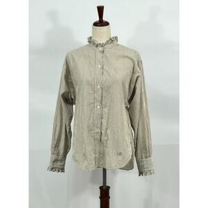 Women's shirt by MARANT Etoile- Isabel Marant. Size 40 or 8 US. Tan stripe ruffle trim Saoli shirt. 100% cotton. Good condition, no stains, holes or pilling