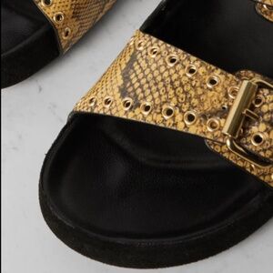 The Isabel Marant 'Lennyo' slides are crafted in Italy from snake-effect leather. They feature adjustable gold-tone buckled straps and eyelet embellishments. These are slides.