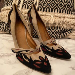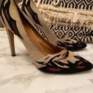 Condition: Used Fair condition dirty throughout the taupe suede. Has black burgundy leather and Suede Taupe. Please see all upclose photos, maybe you can get them redyed or cleaned. Preloved