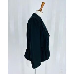 Fabulous black jacket features a two button up front and is collared. It has 3/4 sleeves with tab and button. This jacket is fully lined. Don’t miss out on this Isabella DeMarco black jacket.