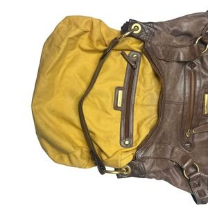 Elevate your boho-chic style with this stunning Isabella Fiore shoulder bag. Crafted from high-quality brown leather with gold hardware accents, this medium-sized bag features stylish studded accents and a comfortable brown strap. With a spacious interior and 16-inch width, 11-inch height, and 3-inch depth, this bag is perfect for carrying all your essentials while still looking fashionable. Whether you're running errands or heading out for a night on the town, this shoulder bag is the perfect accessory for any outfit.