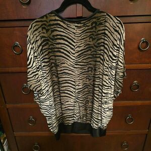This trendy top features bat wing sleeves. It is a very flattering style. Scoop neck trimmed in black to match the bottom.Size M. NWOT.