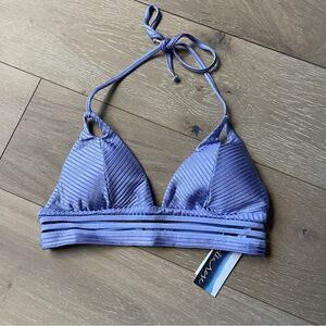 Bikini top features a ribbed fabric with removable cups and cutout detail. Offers an illusion under bust band, adjustable neck ties and a hook back closure.