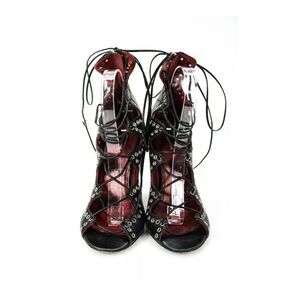 Black, lamb-leather with high stiletto-heel Crossover lace-up front straps and wraparound self-fastening ankle straps Silver-tone metal zip-fastening heel Dark-red leather lining and insole Beige leather sole.
