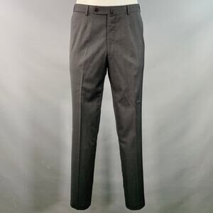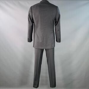 ISAIA for WILKES BASHFORD Aquaspider suit in a charcoal grey wool twill with a full liner and includes a single breasted, double button sport coat with a notch lapel and matching flat front trousers. Made in Italy.