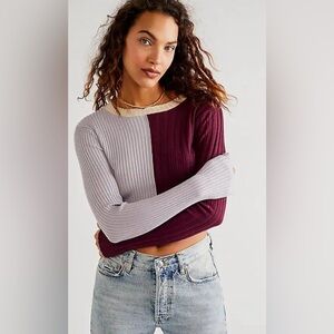 Elegant ribbed top with burgundy and gray colorblock design. Long sleeves for a cozy fit.